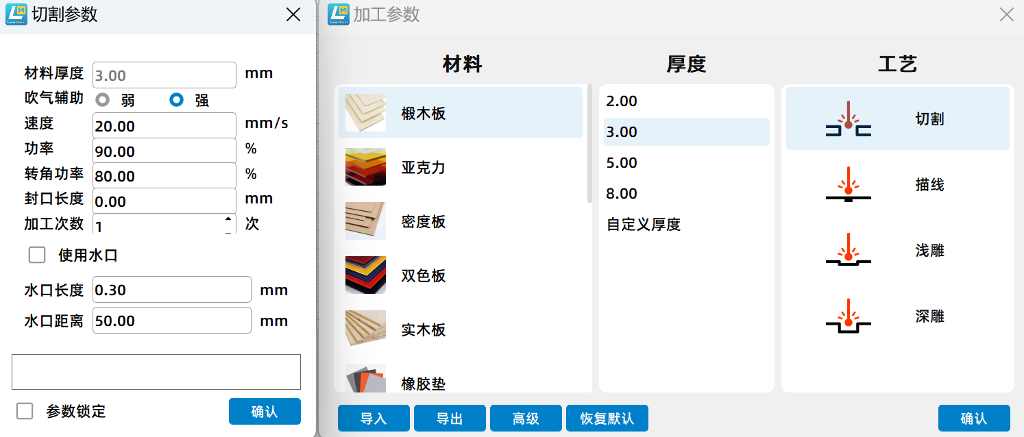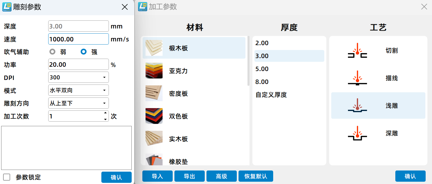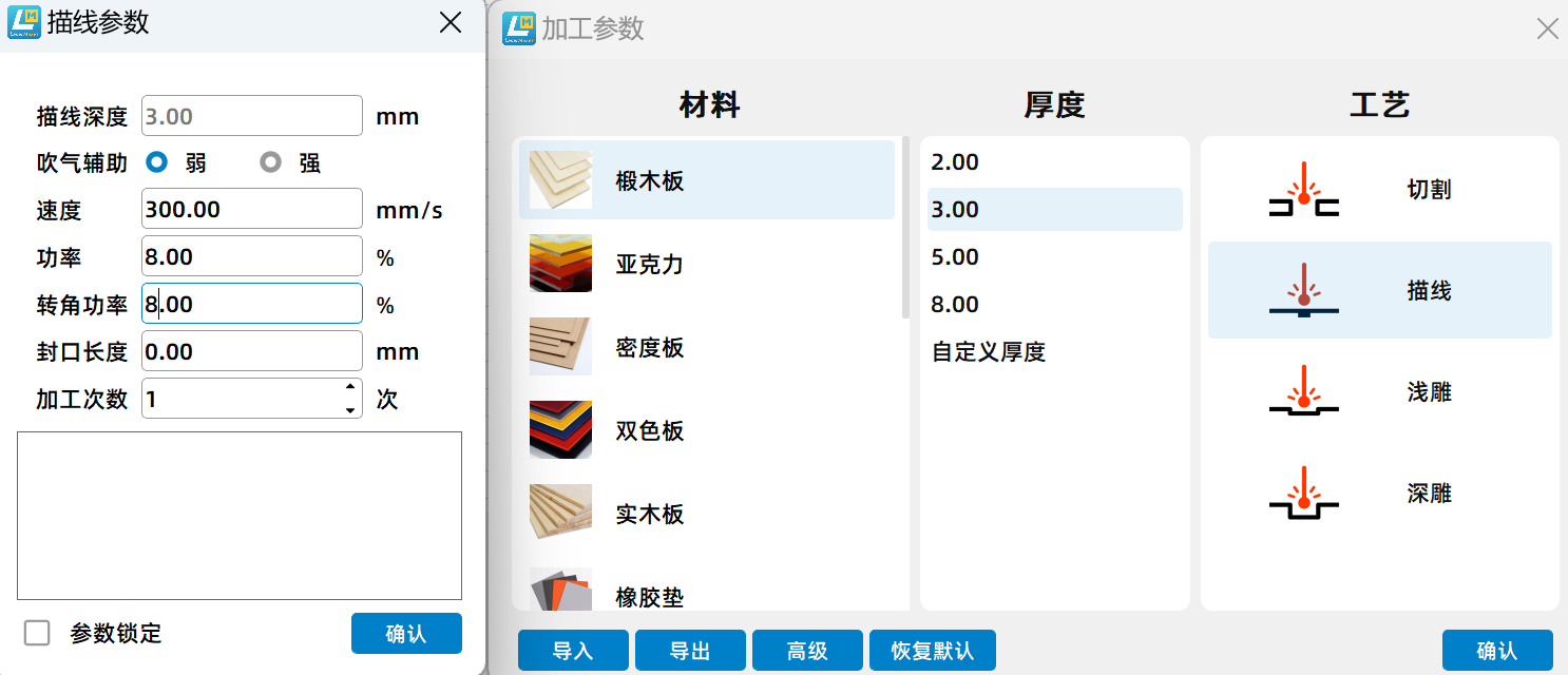 | 加工工艺 | 加工材质 | 模式 | 功率(%) | 速度(mm/s) | 加工次数 |