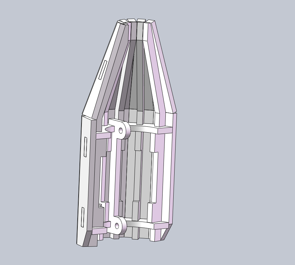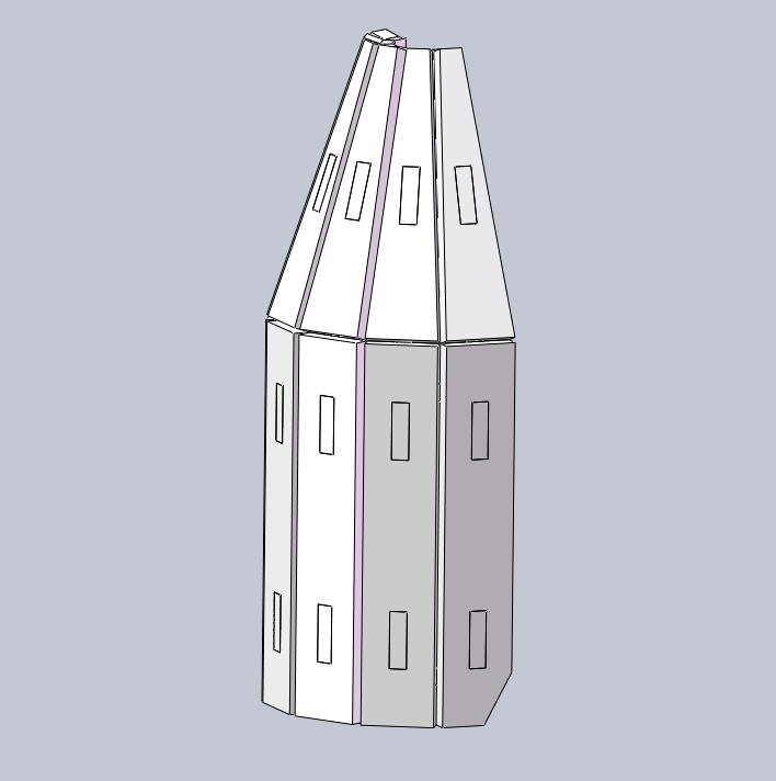 二级火箭火箭要比一级火箭短不少,但是二级火箭的壳体不是一马平川的,需要在一处位置折弯,对于木板的话,就需要分段设计。所以我使用了与一级火箭不同的建模方式,先画出每一份壳体的固定架。