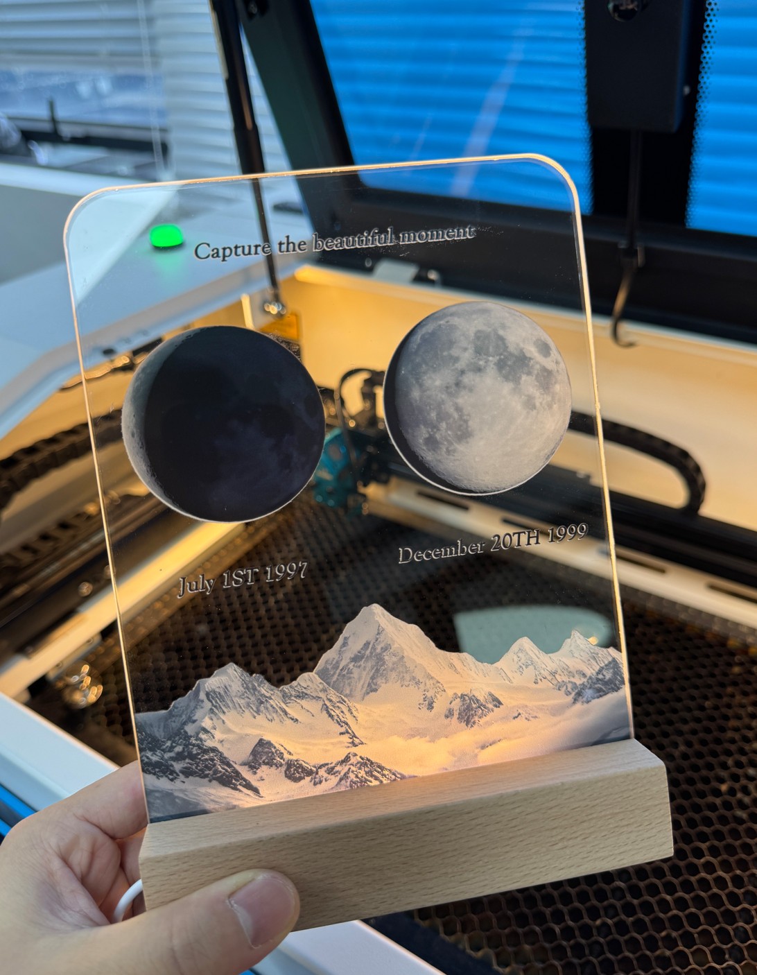 在生成月相图的网站输入出生日期,生成月相图,下载保存至本地,将月相图打印在亚克力上,放置在灯座上即可